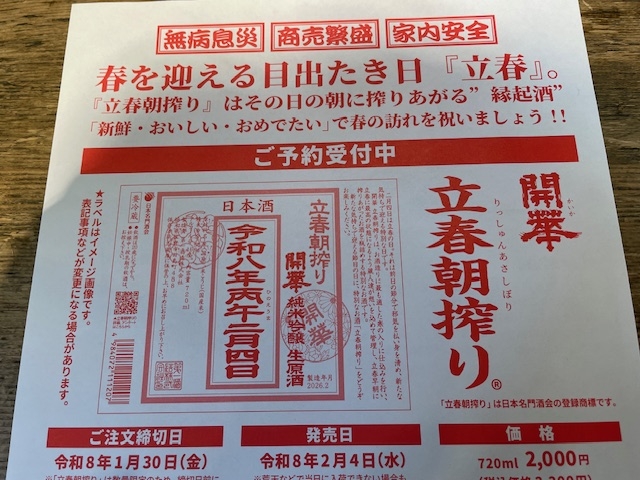 さぁ、皆さん、早いですね。来年令和八年丙午(ひのえうま)の立春朝搾りのご案内です。